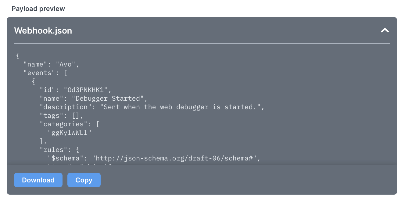 - In the "Payload preview" section click "Click to view payload preview". When the preview has loaded you can either copy or download the JSON file. You can find more details on the format of the JSON in the Publishing docs.